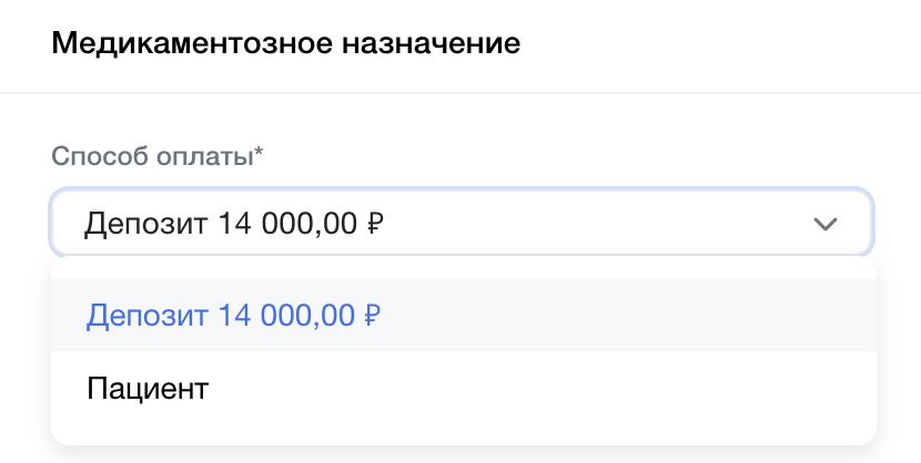 Данный выбор регулируется полем “Способ оплаты” на экране назначения медикамента".