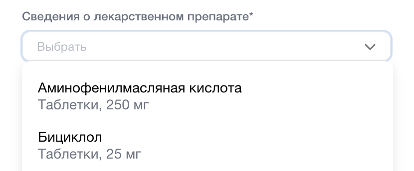Медикаменты выбираются из реестра Минздрава. Поиск производится по действующим веществам.