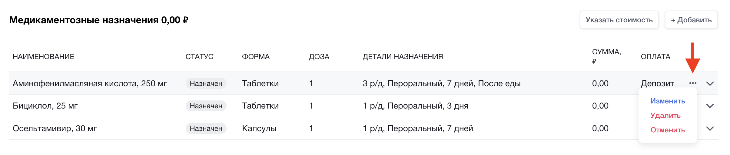 Назначение медикаментов доступно врачам в разделе обращения “План лечения” и в протоколах осмотров и консультаций.