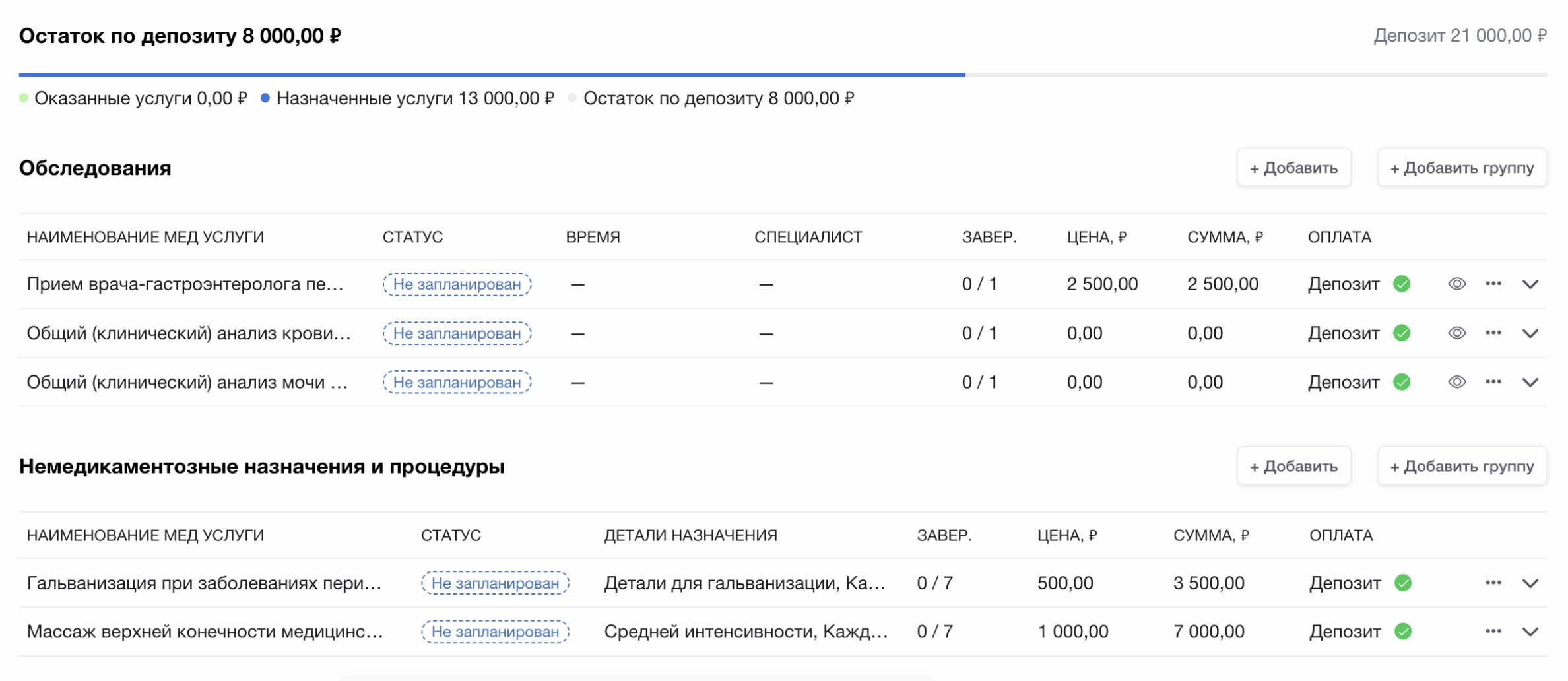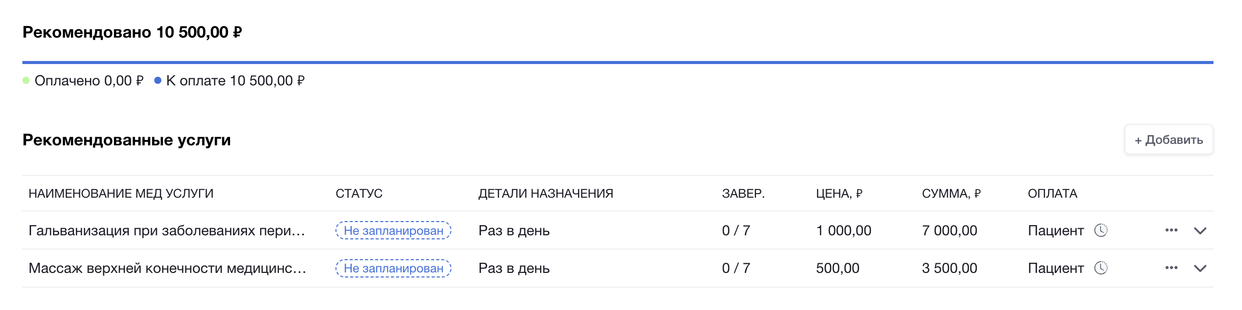 Назначение услуг доступно в разделе “План лечения” обращения пациента, а так же во всех приемах осмотров и консультаций.