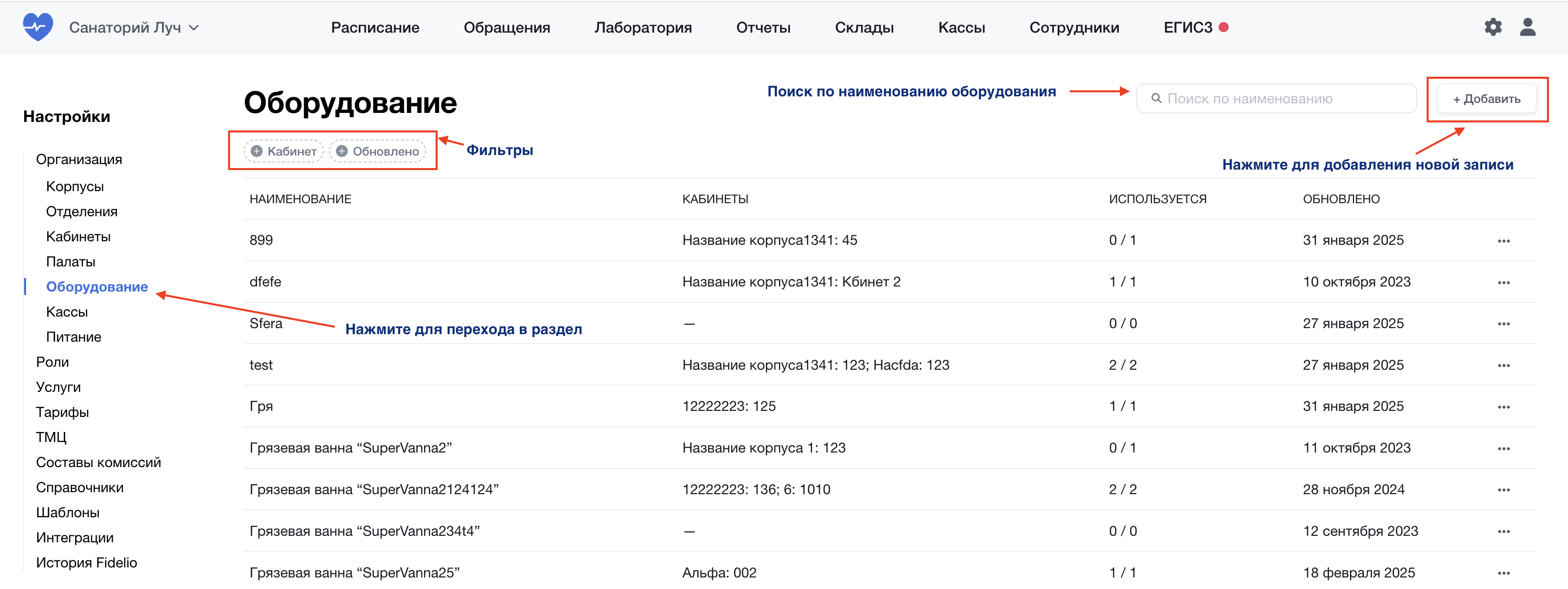 В разделе доступна фильтрация данных по кабинетам и дате обновления, а также поиск по наименованию оборудования.