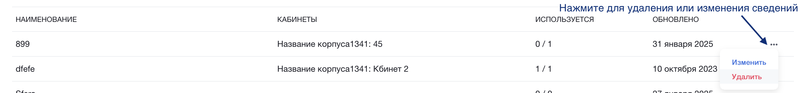 Для удаления или изменения сведений об оборудовании нажмите на «троеточие», расположенное в конце записи, которую хотите изменить.