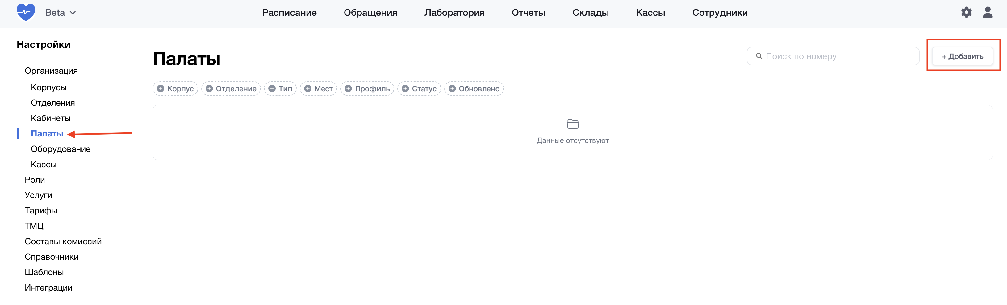 Для заполнения данных выберите в боковой панели “Палаты”. Для внесения сведений о палате нажмите на кнопку “+Добавить”.
