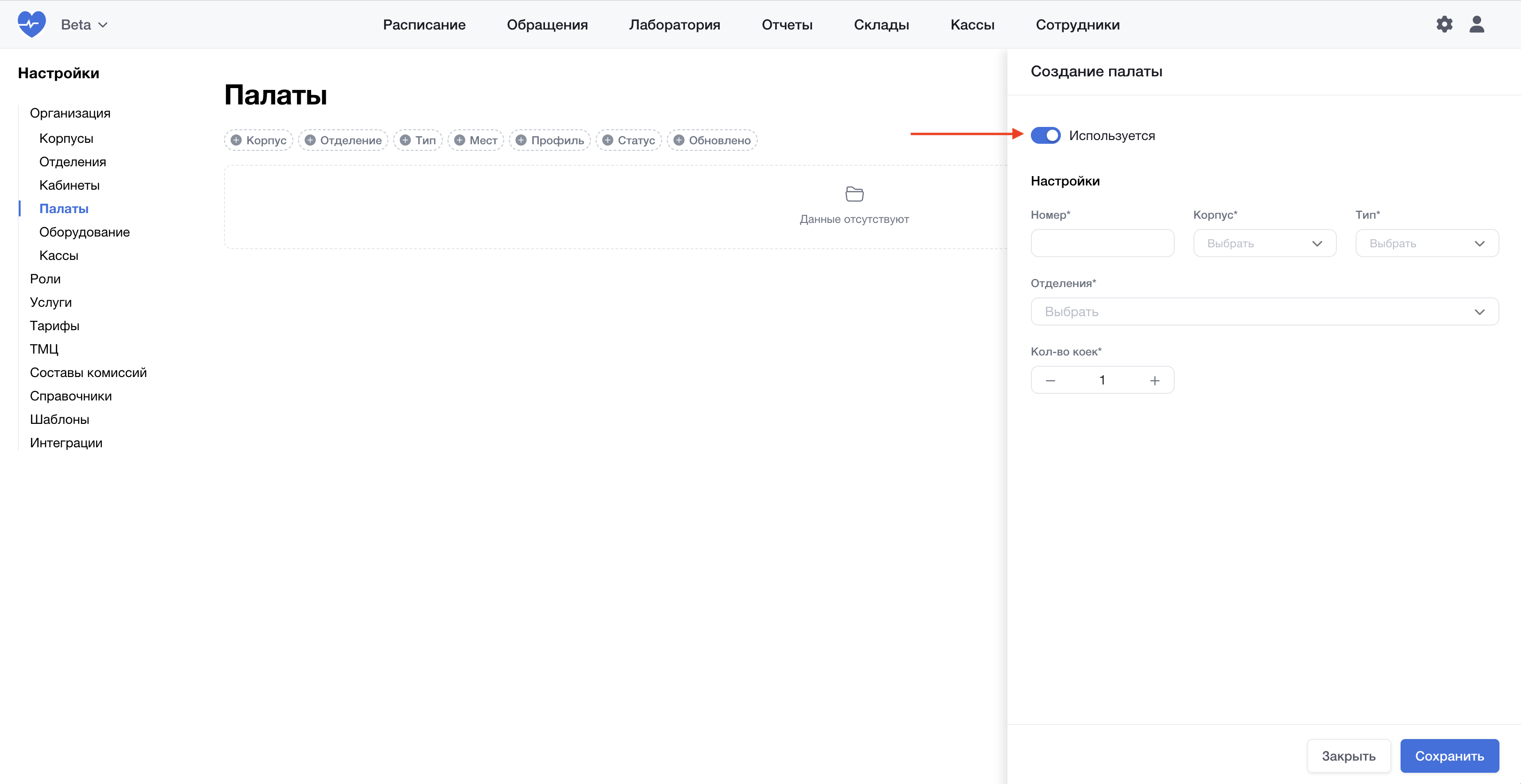 Положение кнопки “Используется” как на рисунке выше означает, что палата введена в эксплуатацию.
