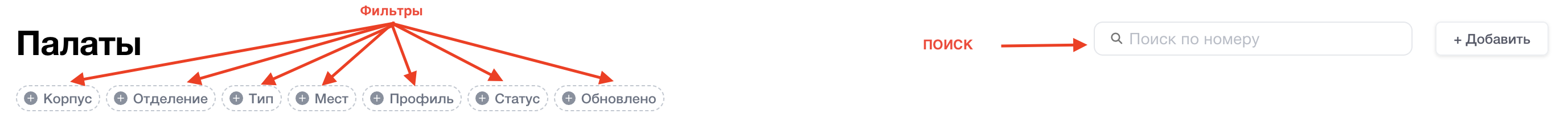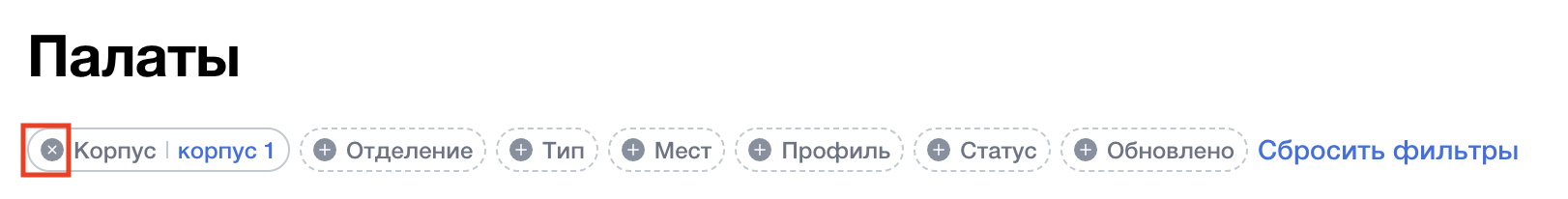 Для работы с разделом доступны функции поиска и фильтрации. Поиск осуществляется по номеру палаты. Фильтрация осуществляется по “корпусу”, “отделению”, “типу”, “месту”, “профилю”, “статусу”, “обновлению”.