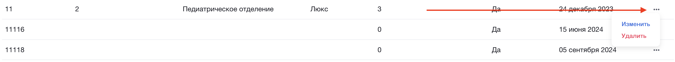 Для удаления платы нажмите на “…” напротив выбранной палаты. На экране появится всплывающее окно, нажмите кнопку “Удалить” и палата будет удалена или “Изменить” если Вы хотите внести изменения в сведения о палате.