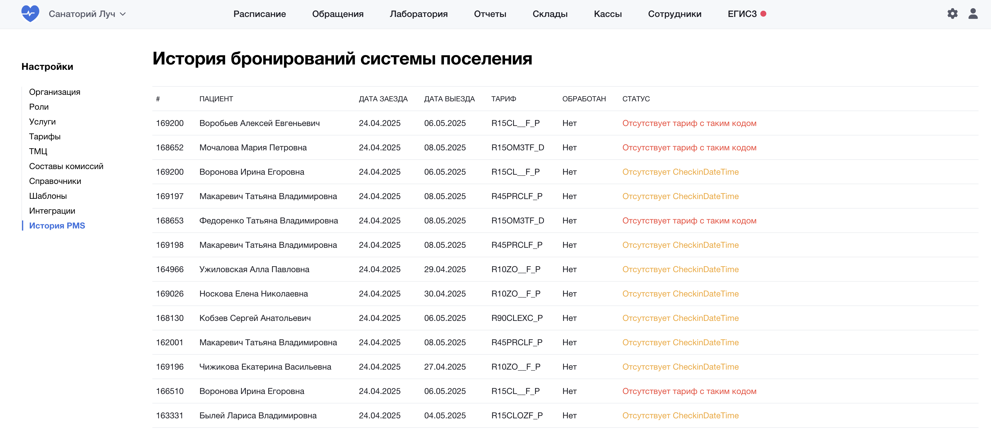 — Бронирование создано в системе поселения, но пациент еще не прошел процедуру заселения (отсутствует время регистрации — Check-in time). Данные пациента станут доступны в МИС только после подтверждения заселения.