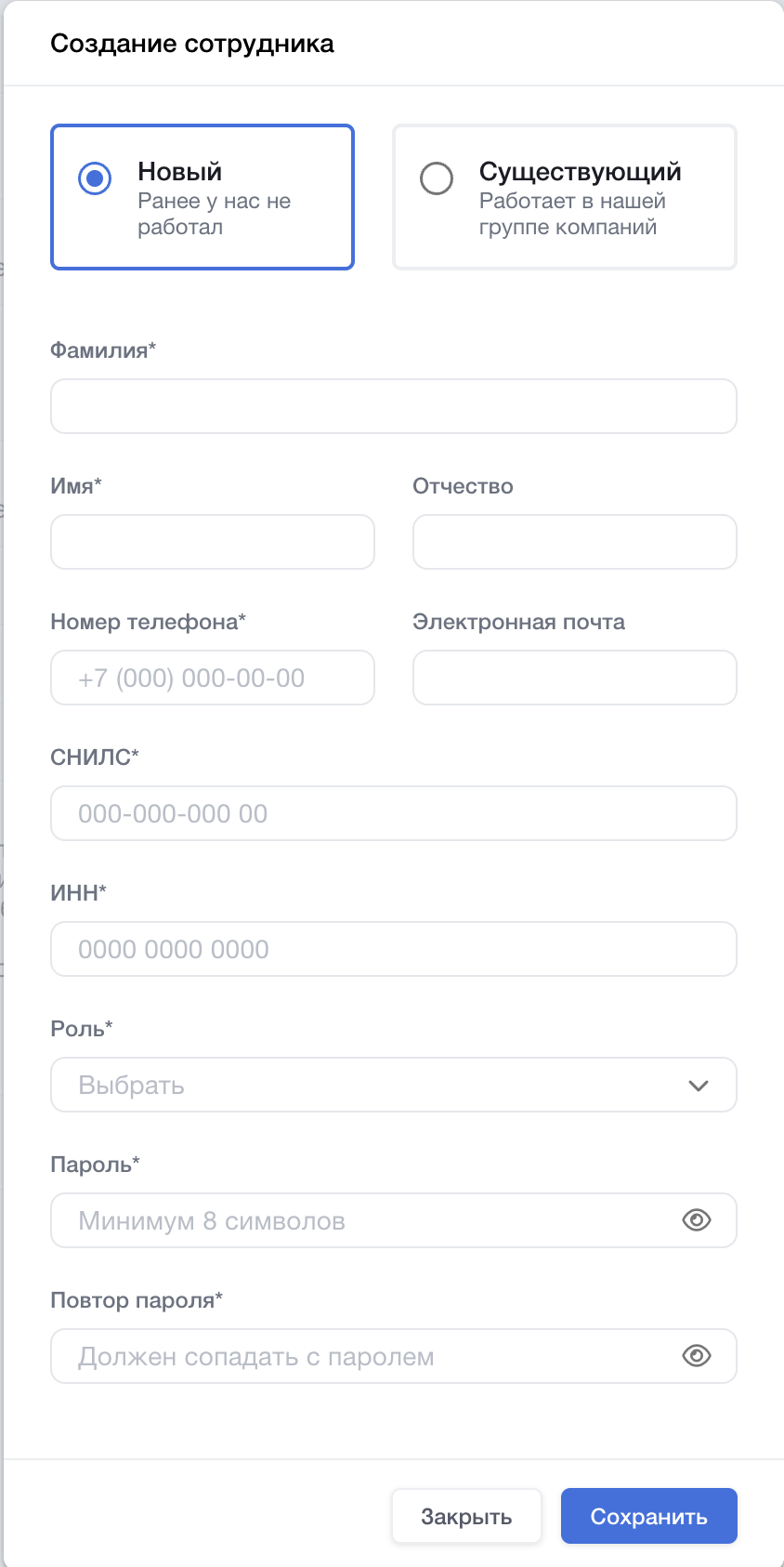 Для внесения сведений о новом сотруднике нажмите кнопку “+ Новый сотрудник”.