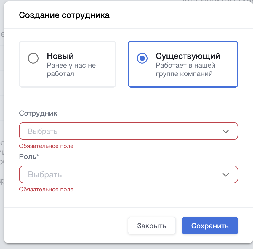 Если сотрудник ранее работал у Вас и был внесен систему либо работает в группе связанных компаний, нажмите на “Существующий”. Далее выберете сотрудника из выпадающего списка. В списке доступен поиск по Ф.И.О.. Выберете роль из списка и нажмите кнопку “Сохранить” либо “Закрыть” если Вы передумали вносить изменения.