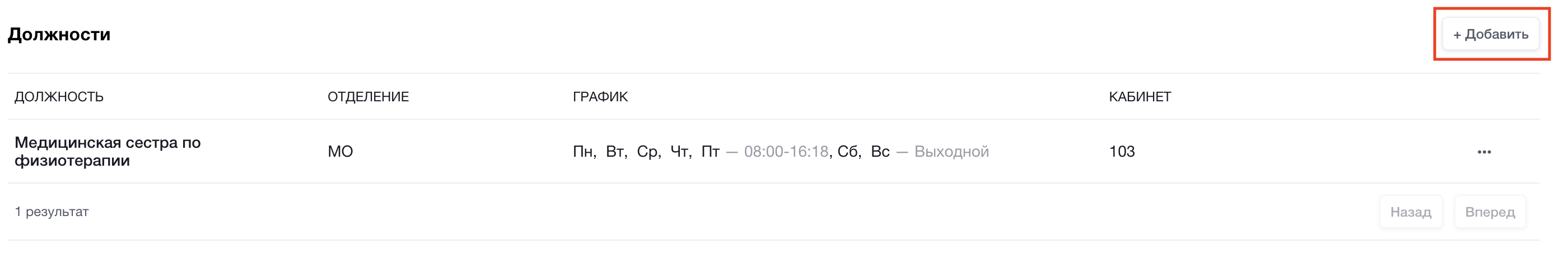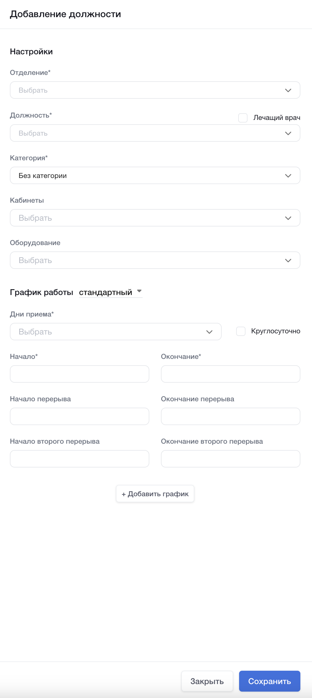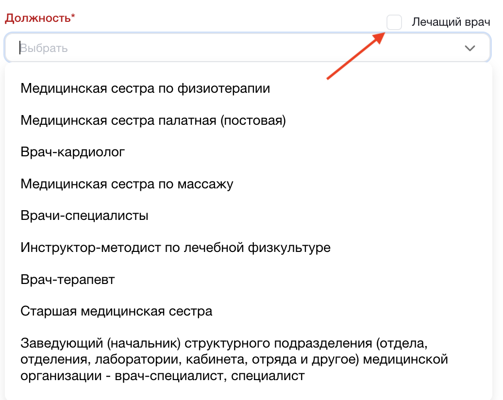 В поле “Должность” доступен поиск, наименования должностей взяты из справочника, разработанного на основе Приказа Минздрава России от 02.05.2023 №205н с учетом позиции регулятора Минздрава для цели ведения в единой государственной информационной системе здравоохранения (ЕГИСЗ). Выберите занимаемую сотрудником должность.