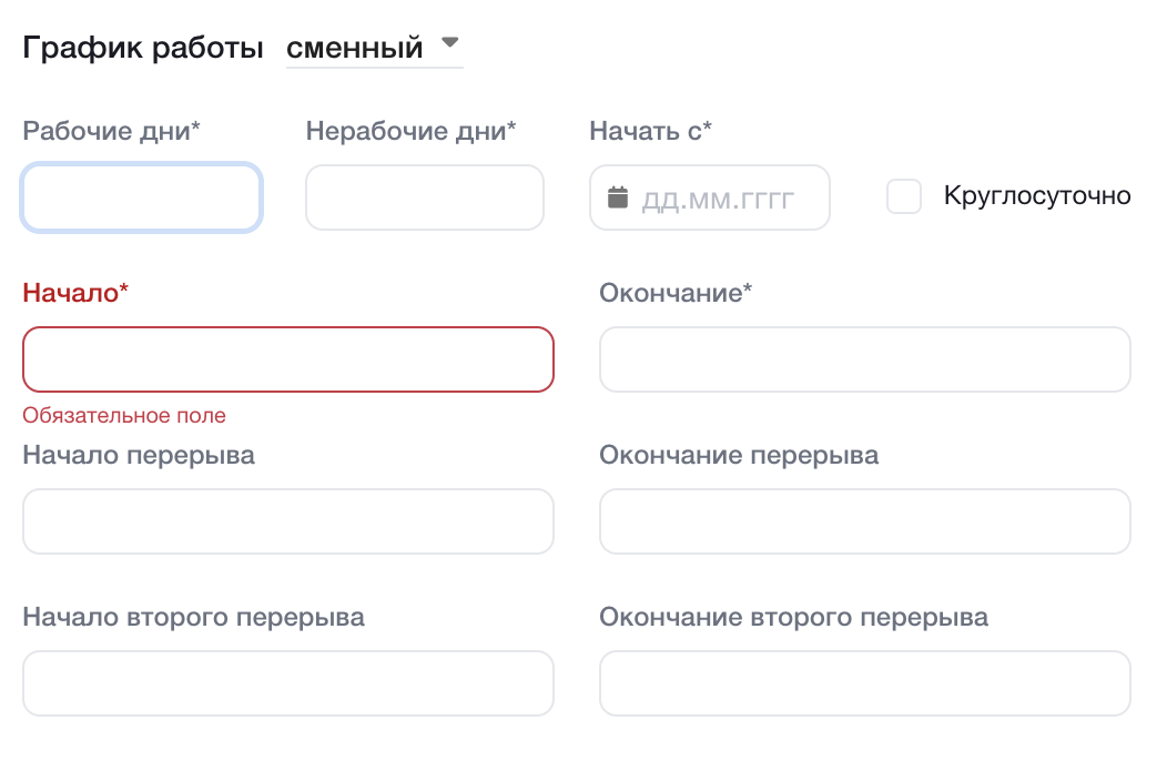 Для сменного графика работы в поле “рабочие дни” заполните сколько дней сотрудник работает в смене. В поле “Нерабочие дни” укажите сколько дней не рабочих между рабочими днями и с какого дня начинает работать сотрудник.