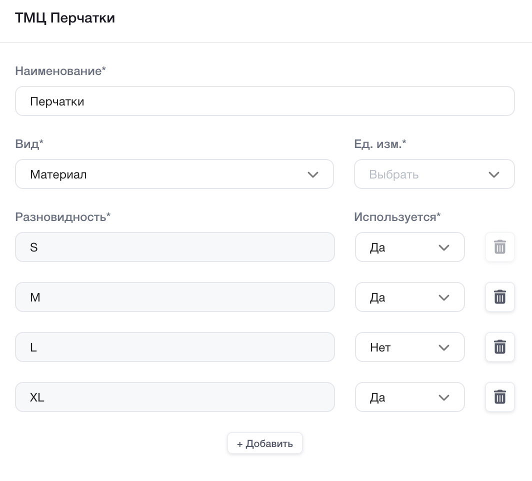 При необходимости нажмите кнопку “+Добавить” для того, чтобы внести дополнительные сведения о разновидности ТМЦ.