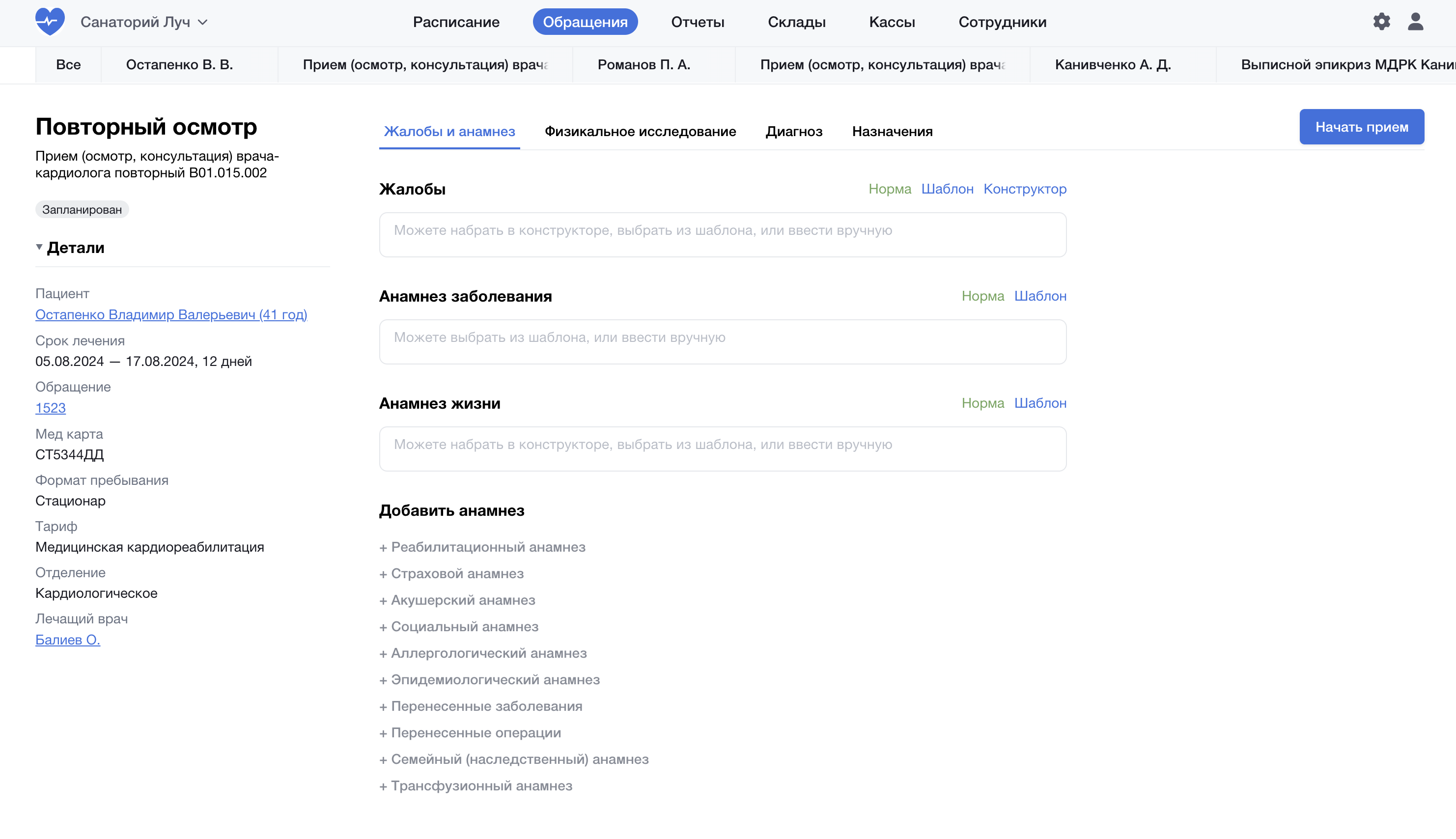 При нажатии на кнопку “Начать прием”, расположенную в правом верхнем углу экрана, ранее заполненные данные в первичном протоколе осмотра или в предшествующем, заполняемому протоколу осмотра заполнятся. При необходимости откорректируйте заполненные данные.